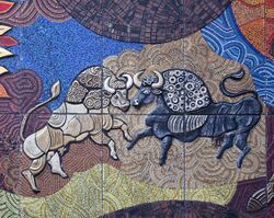 As cattle were a central part of the pastoralist economy of Ancient Nubia, Africa, they also played a prominent role in their culture and mythology, as evidenced by their inclusion in burials and rock art. Starting in the Neolithic period, cattle skulls, also known as bucrania, were often placed alongside human burials. Bucrania were a status symbol, and they were used frequently in adult male burials, occasionally in adult female burials, and rarely in child burials.[71] In cemeteries at Kerma, there is a strong correlation between the number of bucrania and the quantity and lavishness of other grave goods.[72] Dozens if not hundreds of cattle were often slaughtered as tribute for the burial of one individual; 400 bucrania were found at one tumulus alone at Kerma.[73] The use of cattle skulls rather than those of sheep or goats reveals the importance of cattle in their pastoral economy, as well as the cultural associations of cattle with wealth, prosperity, and passage into the afterlife. Sometimes complete cattle were buried alongside their owner, symbolic of their relationship continuing into the afterlife.[74]