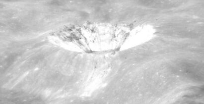 Interior of Petit, showing flat crater floor of impact melt with no visible craters, from Apollo 17