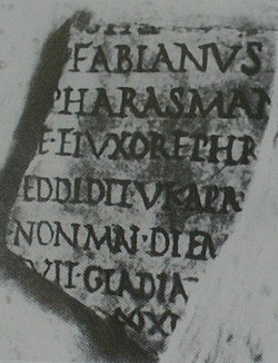 Located at the mouth of the Tiber, Ostia was the chief seaport of Rome from the earliest period until the third century AD, when it was overtaken by Portus.[7] The Fasti Ostienses were inscribed in a public place somewhere in the city, although precisely where is uncertain; perhaps in the local forum, or on the walls of the temple of Vulcan, the location of which has not been identified.[3] In either case, they were probably superintended by the Pontifex Volkani, the priest of Vulcan at Ostia. The surviving fragments of the Ostienses mention this appointment several times.[8] The carving of the Ostian fasti may have begun as early as the dictatorship of Sulla, in 81 BC, but the earliest surviving portion records the events from 49 to 44 BC. The last extant year is AD 175, but there are many gaps, and most of the surviving years are damaged.[4]