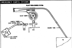 The exit from the bunker was through a 366-meter (1,201 ft) long tunnel, in reality a large air duct, that opened to the outside at the perimeter of the pad. In the event that this route was blocked, there was an emergency escape hatch in the roof of the dome.[2]