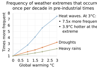 There will likely be multiplicative increases in the frequency of extreme weather events compared to the pre-industrial era for heat waves, droughts and heavy precipitation events, for various climate change scenarios.