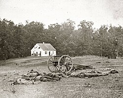 Lincoln spent much of the post-Antietam campaigns rapidly trying to find the United States a worthy commander in the Eastern Front. He relieved General McClellan after his failure to take advantage of Lee's rout at Antietam, but General Ambrose Burnside was reluctant to command and promptly suffered a crushing defeat at the Battle of Fredericksburg in December 1862.[98] Lincoln replaced Burnside with General Joseph Hooker, who then lost the Battle of Chancellorsville in spring 1863.[99] Although Chancellorsville is considered one of Lee's greatest victories, it also marked the beginning of the end for his glory days. His trusted subordinate, General "Stonewall" Jackson, fell to friendly fire during this battle and died from a botched amputation.[99]
