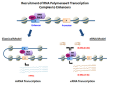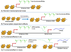 Enhancers as sites of extragenic transcription were initially discovered in genome-wide studies that identified enhancers as common regions of RNA polymerase II (RNA pol II) binding and non-coding RNA transcription.[1][2] The level of RNA pol II–enhancer interaction and RNA transcript formation were found to be highly variable among these initial studies. Using explicit chromatin signature peaks, a significant proportion (~70%) of extragenic RNA Pol II transcription start sites were found to overlap enhancer sites in murine macrophages.[5] Out of 12,000 neuronal enhancers in the mouse genome, almost 25% of the sites were found to bind RNA Pol II and generate transcripts.[6] In parallel studies, 4,588 high confidence extragenic RNA Pol II binding sites were identified in murine macrophages stimulated with the inflammatory mediater lipopolysaccharide to induce transcription.[2] These eRNAs, unlike messenger RNAs (mRNAs), lacked modification by polyadenylation, were generally short and non-coding, and were bidirectionally transcribed. Later studies revealed the transcription of another type of eRNAs, generated through unidirectional transcription, that were longer and contained a poly A tail.[7] Furthermore, eRNA levels were correlated with mRNA levels of nearby genes, suggesting the potential regulatory and functional role of these non-coding enhancer RNA molecules.[1]