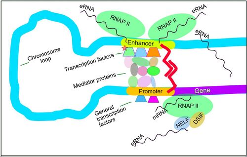 RNA Pol II-mediated gene transcription induces a local opening of chromatin state through the recruitment of histone acetyltransferases and other histone modifiers that promote euchromatin formation. It was proposed that the presence of these enzymes could also induce an opening of chromatin at enhancer regions, which are usually present at distant locations but can be recruited to target genes through looping of DNA.[24] In this model, eRNAs are therefore expressed in response to RNA Pol II transcription and therefore carry no biological function.