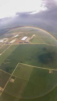 In theory, every rainbow is a circle, but from the ground, usually only its upper half can be seen. Since the rainbow's centre is diametrically opposed to the Sun's position in the sky, more of the circle comes into view as the sun approaches the horizon, meaning that the largest section of the circle normally seen is about 50% during sunset or sunrise. Viewing the rainbow's lower half requires the presence of water droplets below the observer's horizon, as well as sunlight that is able to reach them. These requirements are not usually met when the viewer is at ground level, either because droplets are absent in the required position, or because the sunlight is obstructed by the landscape behind the observer. From a high viewpoint such as a high building or an aircraft, however, the requirements can be met and the full-circle rainbow can be seen.[34][35] Like a partial rainbow, the circular rainbow can have a secondary bow or supernumerary bows as well.[36] It is possible to produce the full circle when standing on the ground, for example by spraying a water mist from a garden hose while facing away from the sun.[37]