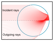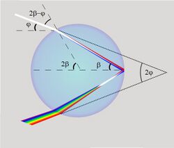 The displacement of the rainbow due to different refractive indices can be pushed to a peculiar limit. For a material with a refractive index larger than 2, there is no angle fulfilling the requirements for the first order rainbow. For example, the index of refraction of diamond is about 2.4, so diamond spheres would produce rainbows starting from the second order, omitting the first order. In general, as the refractive index exceeds a number n + 1, where n is a natural number, the critical incidence angle for n times internally reflected rays escapes the domain [math]\displaystyle{ [0,\frac{\pi}{2}] }[/math]. This results in a rainbow of the n-th order shrinking to the antisolar point and vanishing.