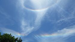 The circumzenithal and circumhorizontal arcs are two related optical phenomena similar in appearance to a rainbow, but unlike the latter, their origin lies in light refraction through hexagonal ice crystals rather than liquid water droplets. This means that they are not rainbows, but members of the large family of halos.