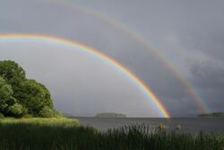 A reflected rainbow may appear in the water surface below the horizon.[42] The sunlight is first deflected by the raindrops, and then reflected off the body of water, before reaching the observer. The reflected rainbow is frequently visible, at least partially, even in small puddles.