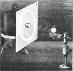 Experiments on the rainbow phenomenon using artificial raindrops, i.e. water-filled spherical flasks, go back at least to Theodoric of Freiberg in the 14th century. Later, also Descartes studied the phenomenon using a Florence flask. A flask experiment known as Florence's rainbow is still often used today as an imposing and intuitively accessible demonstration experiment of the rainbow phenomenon.[85][86][87] It consists in illuminating (with parallel white light) a water-filled spherical flask through a hole in a screen. A rainbow will then appear thrown back / projected on the screen, provided the screen is large enough. Due to the finite wall thickness and the macroscopic character of the artificial raindrop, several subtle differences exist as compared to the natural phenomenon,[88][89] including slightly changed rainbow angles and a splitting of the rainbow orders.