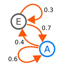 A diagram representing a two-state Markov chain. The states are represented by 'A' and 'E'. The numbers are the probability of flipping the state.
