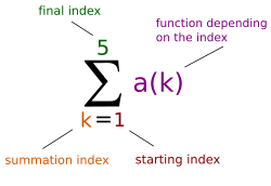 Mathematical notation is widely used in science and engineering for representing complex concepts and properties in a concise, unambiguous, and accurate way. This notation consists of symbols used for representing operations, unspecified numbers, relations and any other mathematical objects, and then assembling them into expressions and formulas.[94] More precisely, numbers and other mathematical objects are represented by symbols called variables, which are generally Latin or Greek letters, and often include subscripts. Operation and relations are generally represented by specific symbols or glyphs,[95] such as + (plus), × (multiplication), (integral), = (equal), and < (less than).[96] All these symbols are generally grouped according to specific rules to form expressions and formulas.[97] Normally, expressions and formulas do not appear alone, but are included in sentences of the current language, where expressions play the role of noun phrases and formulas play the role of clauses.