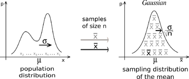 Whatever the form of a random population distribution (μ), the sampling mean (x̄) tends to a Gaussian distribution and its variance (σ) is given by the central limit theorem of probability theory.[59]