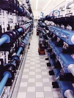 In July 1992 LLNL responded to these suggestions with the Nova Upgrade, which would reuse the majority of the existing Nova facility, along with the adjacent Shiva facility. The resulting system would be much lower power than the LMF concept, with a driver of about 1 to 2 MJ.[19] The new design included a number of features that advanced the state of the art in the driver section, including the multi-pass design in the main amplifiers, and 18 beamlines (up from 10) that were split into 288 "beamlets" as they entered the target area in order to improve the uniformity of illumination. The plans called for the installation of two main banks of laser beam lines, one in the existing Nova beam line room, and the other in the older Shiva building next door, extending through its laser bay and target area into an upgraded Nova target area.[20] The lasers would deliver about 500 TW in a 4 ns pulse. The upgrades were expected to allow the new Nova to produce fusion yields between 2 and 20 MJ[17] The initial estimates from 1992 estimated construction costs around $400 million, with construction taking place from 1995 to 1999.
