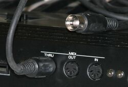 Most MIDI capable instruments feature a MIDI IN, MIDI OUT, and occasionally a MIDI THRU connection in the form of five-pin DIN connectors. In order to build a two-way physical connection between two devices, a pair of cables must be used. The MIDI THRU jack simply echoes the signal entering the device at MIDI-IN. This makes it possible to control several devices from a single source.