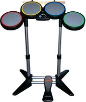 The drum controller features four rubber drum pads and a kick pedal. The pads have colored rings around the edges that correspond to the notes on-screen, representing the snare drum (red), hi-hat (yellow), tom-tom (blue), and crash cymbal (green). The kick pedal simulates the bass drum, with on-screen notes represented as orange horizontal lines. A pair of authentic drum sticks are included with the controller. Drummers can improvise in special "freestyle drum fill" sections of songs, indicated by the columns for each note turning a solid color. Overdrive for drummers can be deployed by hitting the crash cymbal (green note for right-handed configuration) that appears directly after a freestyle drum fill. Harmonix representatives have suggested, "If you can play the drum parts on hard, you can pretty much play the drums [in reality]."[13][14]