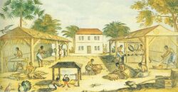 Another commodity that was a prominent source of trade was the production of sugar from the crop sugarcane. The original habitat of sugar was in India, where it was taken and planted in various islands. Once reaching to the people of the Iberian Peninsula, it was further migrated across the Atlantic Ocean. In the 16th century, the first plantations of sugar were started in the New World, marking the last great stage of migration of the cane to the West.[34] Because of the conflict of transporting sugar in its raw form, sugar was not associated with commerce until the act of refining it came into play; this act became the center for industry. Venice was the center for refining during the Middle Ages, therefore making them the chief traders of sugar. Although, the Spanish and Portuguese held the monopolies of the sugarcane fields in America, they were being supplied by Venice. In the 17th century, England dominated Venice and became the center for refining and cultivating sugar; this leadership was maintained until the rise of French industry.[35] Sugar throughout the 17th century was still considered a luxury until the latter half of the 17th century when the sugar was being produced in mass quantities making it available to the mass of the English people.[36] This turn of events made the sugar a commodity, because the crop was not being used in only special occasion, but in all daily meals.