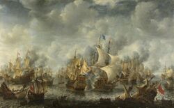 The First Anglo-Dutch War was a naval conflict between England and the Dutch Republic from 1652 to 1654 and was over the competition in commercial maritime and was focused mainly in the East Indies.[38] The first Navigation Act, which forbade the import of goods unless they were transported either in English vessels or by vessels from the country of origin.[38] This was a policy aimed against the Dutch, and fighting broke out on May 19, 1652 with a small skirmish between Dutch and English fleets.[38] The War officially began in July and fighting continued for two years. The Battle of Scheveningen which is also referred to as Texel was the end of serious fighting in the war and took place in July 1653.[39] The Treaty of Westminster was signed in April 1654 ending the war and obligated the Dutch Republic to respect the Navigation Act as well as compensate England for the war.[39]