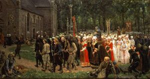 The greater part of the day is spent in prayer, and the pardon begins with an early Mass at 4 AM. Its observance, however, has actually commenced earlier, for the preceding evening is devoted to confession, and the rosary is generally recited by the pilgrims the whole way to the place of the pardon. After the religious service, a great procession takes place around the church. This is the most picturesque part of the pardon and may be regarded as its mise en scène. At Ste-Anne d'Auray, this procession is especially striking. In the procession join all those who believe that the intercession of St. Anne has saved them in times of peril. Sailors will carry fragments of a vessel, upon which they escaped in a shipwreck; the once lame will carry on their shoulders crutches which they no longer need; and those rescued from fire will carry the rope or ladder by which they escaped from the flames.