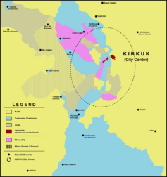 Kirkuk is located in a disputed area of Iraq that runs from Sinjar on the Syrian border southeast to Khanaqin and Mandali on the Iranian border.[53] Kirkuk has been a disputed territory for around eighty years — Kurds wanted Kirkuk to become part of the Kurdistan Region, which has been opposed by the region's Arab and Turkmen populations.[54]