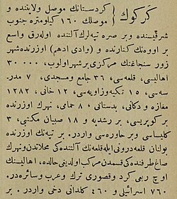 Şemseddin Sâmi mentioned Kirkuk city in the Kâmûsü'l-A'lâm written in the late 19th century. And says "Kirkuk is located to the southeast of the Mosul vilayet in Kurdistan, with a population of 30,000." then he says "The Kurds make up three-quarters of the people of Kirkuk, and the rest are Turks, Arabs, 760 Jews and 460 Chaldeans."[70][71]