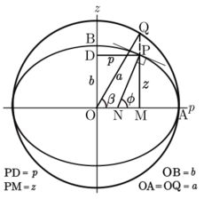 The parametric latitude or reduced latitude, β, is defined by the radius drawn from the centre of the ellipsoid to that point Q on the surrounding sphere (of radius a) which is the projection parallel to the Earth's axis of a point P on the ellipsoid at latitude ϕ. It was introduced by Legendre[11] and Bessel[12] who solved problems for geodesics on the ellipsoid by transforming them to an equivalent problem for spherical geodesics by using this smaller latitude. Bessel's notation, u(ϕ), is also used in the current literature. The parametric latitude is related to the geodetic latitude by:[6][7]
