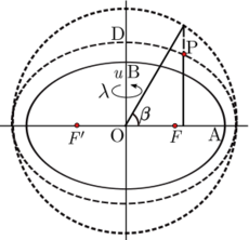 The parametric latitude can also be extended to a three-dimensional coordinate system. For a point P not on the reference ellipsoid (semi-axes OA and OB) construct an auxiliary ellipsoid which is confocal (same foci F, F′) with the reference ellipsoid: the necessary condition is that the product ae of semi-major axis and eccentricity is the same for both ellipsoids. Let u be the semi-minor axis (OD) of the auxiliary ellipsoid. Further let β be the parametric latitude of P on the auxiliary ellipsoid. The set (u,β,λ) define the ellipsoidal-harmonic coordinates[19] or simply ellipsoidal coordinates[5]:§4.2.2 (although that term is also used to refer to geodetic coordinate). These coordinates are the natural choice in models of the gravity field for a rotating ellipsoidal body. The above applies to a biaxial ellipsoid (a spheroid, as in oblate spheroidal coordinates); for a generalization, see triaxial ellipsoidal coordinates.