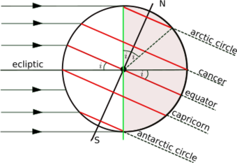 The figure shows the geometry of a cross-section of the plane perpendicular to the ecliptic and through the centres of the Earth and the Sun at the December solstice when the Sun is overhead at some point of the Tropic of Capricorn. The south polar latitudes below the Antarctic Circle are in daylight, whilst the north polar latitudes above the Arctic Circle are in night. The situation is reversed at the June solstice, when the Sun is overhead at the Tropic of Cancer. Only at latitudes in between the two tropics is it possible for the Sun to be directly overhead (at the zenith).