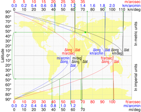 The following graph illustrates the variation of both a degree of latitude and a degree of longitude with latitude.