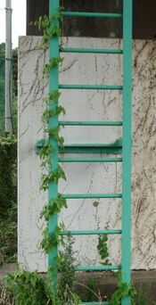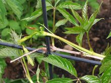 One odd group of vining plants is the fern genus Lygodium, called climbing ferns.[10] The stem does not climb, but rather the fronds (leaves) do. The fronds unroll from the tip, and theoretically never stop growing; they can form thickets as they unroll over other plants, rockfaces, and fences.