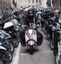 Rider looking for a place at parking lot in Trieste, where use of a scooter in city transport is among highest in Italy.[citation needed]