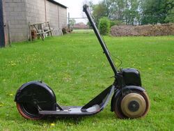 The motoped entered production in 1915, and is believed to be the first motor scooter.[16] They were followed that year by the Autoped, whose engine was engaged by pushing the handlebar column forward and whose brake was engaged by pulling the column back.[17] Autopeds were made in Long Island, New York[18] from 1915 to 1921,[17] and were also made under license by Krupp in Germany from 1919 to 1922, following World War I.[19]