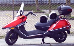 Since the 1980s Japan, and latterly China and Taiwan, have become world leaders in the mass production of plastic bodied scooters,[59] most often with "twist-and-go" type transmissions (where gear selection and clutch operation are fully automatic). A popular early model being the Honda Spree/Nifty Fifty. Advertising campaigns in the USA featured popular stars like Michael Jackson (Suzuki), and Grace Jones and Lou Reed (Honda),[60] and sales of Japanese scooters peaked there in the 1980s.[61][62] Both 2-stroke and 4-stroke plastic bodied scooters have been mass-produced in East Asia, with engine and transmission designs being either local designs or license built versions of European engines (eg Minarelli or Morini). A popular 4-stroke engine in Chinese production is the GY6 engine, but electric motor-scooters are constantly increasing in the Chinese home market share.