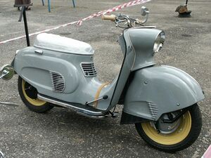 After World War II, wartime aircraft manufacturers were forbidden from making aircraft, and had to find other products to make in order to stay in business. Fuji Sangyo, a part of the former Nakajima Aircraft Company, began production of the Fuji Rabbit S-1 scooter in June 1946. Inspired by Powell scooters used by American servicemen, the S1 was designed to use surplus military parts, including the tailwheel of a Nakajima bomber, re-purposed as the front wheel of the S1.[37][38] Later that year, Mitsubishi introduced the C10, the first of its line of Silver Pigeon scooters.[39][40] This was inspired by a Salsbury Motor Glide that had been brought to Japan by a Japanese man who had lived in the United States.[40]