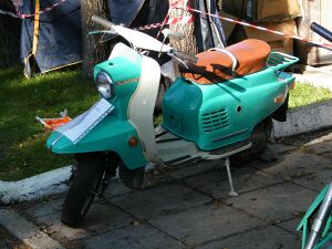 In Eastern Bloc countries scooters also became popular in the second half of 1950s, but their production was a result of planned economy rather than market competition. The Soviet Union started in 1957 with producing reverse engineered copies of 150 cc Vespa and 200 cc Glas Goggo as Vyatka and Tula T-200 respectively.[53] They and their developments were manufactured in big numbers into the 1980s. In East Germany, IWL manufactured several own design 125 cc and 150 cc scooters (most notably SR 59 Berlin) from 1955 to 1964, when the authorities decided to switch the production to trucks.[54] There were also produced small 50 cc Simson scooters, manufactured into the 1990s.[55] From 1959 until 1965 there was produced the only Polish scooter, 150 cc to 175 cc WFM Osa.[56] In Czechoslovakia, there was produced a unique 175 cc scooter Čezeta at the outbreak of 1950s/1960s, then there remained only small 50 cc Jawa scooter-style mopeds.[57]