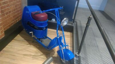 E. Foster Salsbury and Austin Elmore developed the Salsbury Motor Glide, which was a division of Northrop Aircraft,[26] a scooter with a seat above an enclosed drivetrain, and began production in 1936 in California. In 1938, Salsbury introduced a more powerful scooter with a continuously variable transmission (CVT). This was the first use of a CVT on a scooter.[27] It was such a success that Salsbury attempted to license the design to several European manufacturers including Piaggio. The Motor Glide set the standards for all later models. It inspired production of motor scooters by Powell, Moto-scoot, Cushman, Rock-Ola, and others.[28]