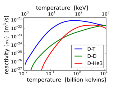 The fusion reaction rate increases rapidly with temperature until it maximizes and then gradually drops off. The deuterium-tritium (D-T) fusion rate peaks at a lower temperature (about 70 keV, or 800 million kelvin) and at a higher value than other reactions commonly considered for fusion energy.
