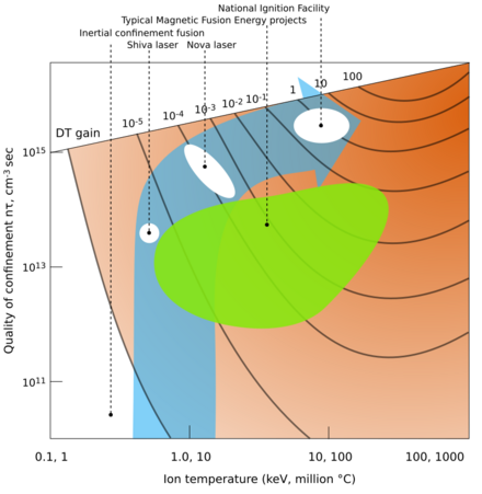 Fusion trapping (left) against temperature (bottom) for various fusion approaches as of 2021, assuming DT fuel[7][clarification needed]