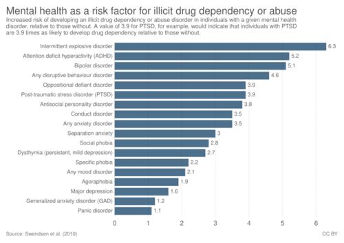 Alcohol dependence or abuse rates were shown to have no correspondence with any person's education level when populations were surveyed in varying degrees of education from ages 26 and older. However, when it came to illicit drug use there was a correlation, in which those that graduated from college had the lowest rates. Furthermore, dependence rates were greater in unemployed populations ages 18 and older and in metropolitan-residing populations ages 12 and older.[46]