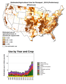 In the United States, paraquat is available primarily as a solution in various strengths. It is classified as a restricted use pesticide, which means that it can be used by licensed applicators only. According to an October 2021 estimate, the use of paraquat in US agriculture as mapped by the US Geological Survey showed a doubling from 2013 to 2018, reaching 10,000,000 pounds (4,500,000 kg) annually.[21]