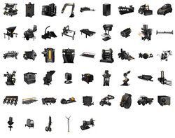Compressed earth block press v4 · Concrete mixer · Sawmill · Bulldozer · Backhoe
