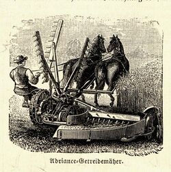 Before c. 1790 a worker could harvest 1/4 acre per day with a scythe.[27] In the early 1800s the grain cradle was introduced, significantly increasing the productivity of hand labor. It was estimated that each of Cyrus McCormick's horse pulled reapers (Ptd. 1834) freed up five men for military service in the U.S. Civil War.[50] By 1890 two men and two horses could cut, rake and bind 20 acres of wheat per day.[27] In the 1880s the reaper and threshing machine were combined into the combine harvester. These machines required large teams of horses or mules to pull. Over the entire 19th century the output per man hour for producing wheat rose by about 500% and for corn about 250%.[20]
