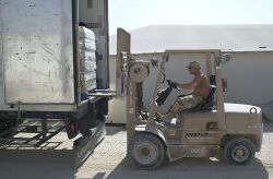 thumbnail|Unloading cotton c. 1900. Hydraulic cranes were in use in the U.K. for loading ships by the 1840s, but were little used in the U.S.[21] Steam powered conveyors and cranes were used in the U.S. by the 1880s.[27] In the early 20th century, electric operated cranes and motorized mobile loaders such as forklifts were used. Today non-bulk freight is containerized.
