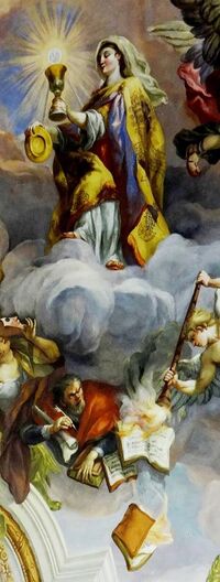 The Virgin Mary played an increasingly central role in Catholic devotions. The victory at the Battle of Lepanto in 1571 was accredited to the Virgin Mary and signified the beginning of a strong resurgence of Marian devotions.[35] During and after the Catholic Reformation, Marian piety experienced unforeseen growth with over 500 pages of mariological writings during the 17th century alone.[36] The Jesuit Francisco Suárez was the first theologian to use the Thomist method on Marian theology. Other well-known contributors to Marian spirituality are Saints Lawrence of Brindisi, Robert Bellarmine, and Francis de Sales.