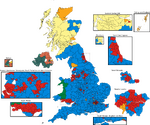 This map shows the Conservative Party landslide victory in 1983.This map shows the Labour Party landslide victory in 1997.This map shows the Conservative Party landslide victory in 2019.This map shows the Labour Party landslide victory in 2024.