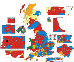 2019 – Boris Johnson led the Conservative Party to win a landslide victory (his second term in office) with 365 seats (an increase of 48, the party's highest seat count since 1987) and a majority of 80 seats, while the Labour Party led by Jeremy Corbyn won 202 seats (a decrease of 60, the party's worst result since 1935). The election led to 54 Labour seats changing to Conservative predominantly in the Midlands and Northern England – some of which had been held by Labour since the first half of the 20th century.[27]