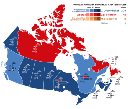 1958 – The Progressive Conservatives, lead by John Diefenbaker won 208 seats (an increase of 96) and gained a majority of 75, while the Liberals, lead by Lester B. Pearson, won just 48 (a decrease of 57).