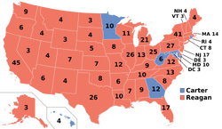 1980 – Ronald Reagan (R) received 489 (90.9%) of the electoral votes while Jimmy Carter (D) received only 49 (9.1%).
