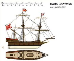 Similar in shape to a brigantine, the zabra was square-rigged with a lateen mizzen sail and had six banks of oars. While sails were necessary for crossing the Atlantic and traveling long distances, oars allowed for better maneuverability in the absence of wind, for ascending rivers, or for quickly escaping combat in shallow waters. They also allowed the main ship of an expedition to remain at a discrete distance offshore while the smaller ship reconnoitered an enemy port. Zabras often functioned as courier vessels and provided logistical support to the fleets as well.[6] Several dozen zabras were used in postal and commercial traffic on the Bay of Biscay under the patronage of the Almirantazgo, the Spanish Admiralty.[4]