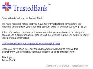 An example of a phishing email, disguised as an official email from a (fictional) bank. The sender is attempting to trick the recipient into revealing confidential information by confirming it at the phisher's website. Note the misspelling of the words received and discrepancy as recieved and discrepency, respectively. Although the URL of the bank's webpage appears to be legitimate, the hyperlink points at the phisher's webpage.