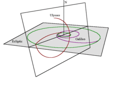 About a year after Galileo the twin instrument[5] was selected for the out-of-ecliptic Ulysses mission. Ulysses was a spinning spacecraft with the dust detector mounted at 85° to the spin axis. Launch of Ulysses was in 1990 and the spacecraft went on a direct trajectory to Jupiter which it reached in 1992 for a swing-by maneuver which put the spacecraft on a heliocentric orbit of 80 degrees inclination. This orbit had a period of 6.2 years and a perihelion of 1.25 AU and an aphelion of 5.4 AU. Ulysses completed 2.5 orbits until the mission was ended. The Ulysses dust detector operated during the whole mission.